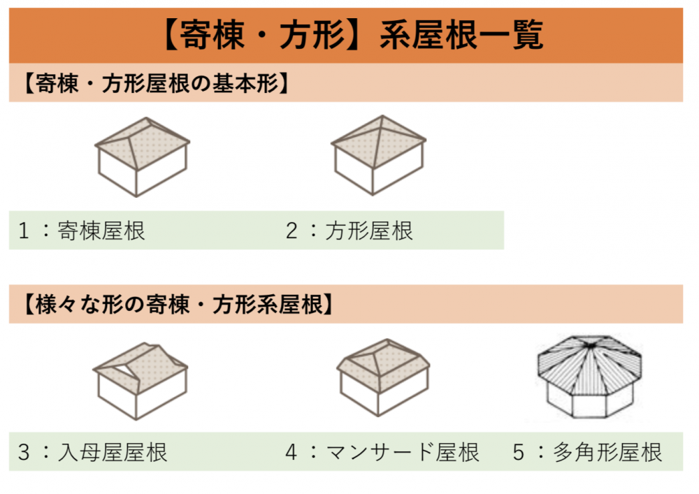 今回の記事では、「1:切妻系屋根」「2:片流れ系屋根」「3:寄棟・方形系屋根」の屋根の形の中で「寄棟・方形系の屋根」に焦点をあて、寄棟・方形系の屋根の下記5種について、屋根の特徴とメリット、デメリットを交えて解説していきます。