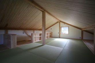 急勾配の寄棟屋根とすることで出来た小屋裏空間を、収納スペースとしてロフトを設置したり、あらわし仕上げにするなどをして、開放的な空間をつくることができます。