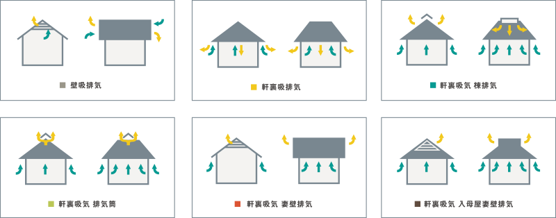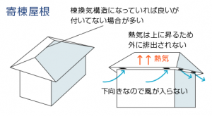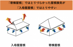 また、方形屋根は、一般的に「屋根換気」が取りづらい屋根になりますが、屋根の一部が持ち上がったような形式で「換気」や「採光」を行う「越屋根(こしやね)」を頂部に設置すれば、換気がとりやすくなるメリットが生まれます。