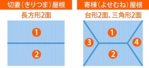 寄棟屋根は、平面で見ると、妻側2面が「三角形」、平側2面が「台形」をした屋根の形状となっています。