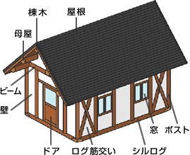 ログハウスの骨組みとなる「柱(はしら)」と「梁(はり)」に丸太を使う以外は、一般的な木造住宅(在来工法)とほとんど同じような組み立てられ方をします。