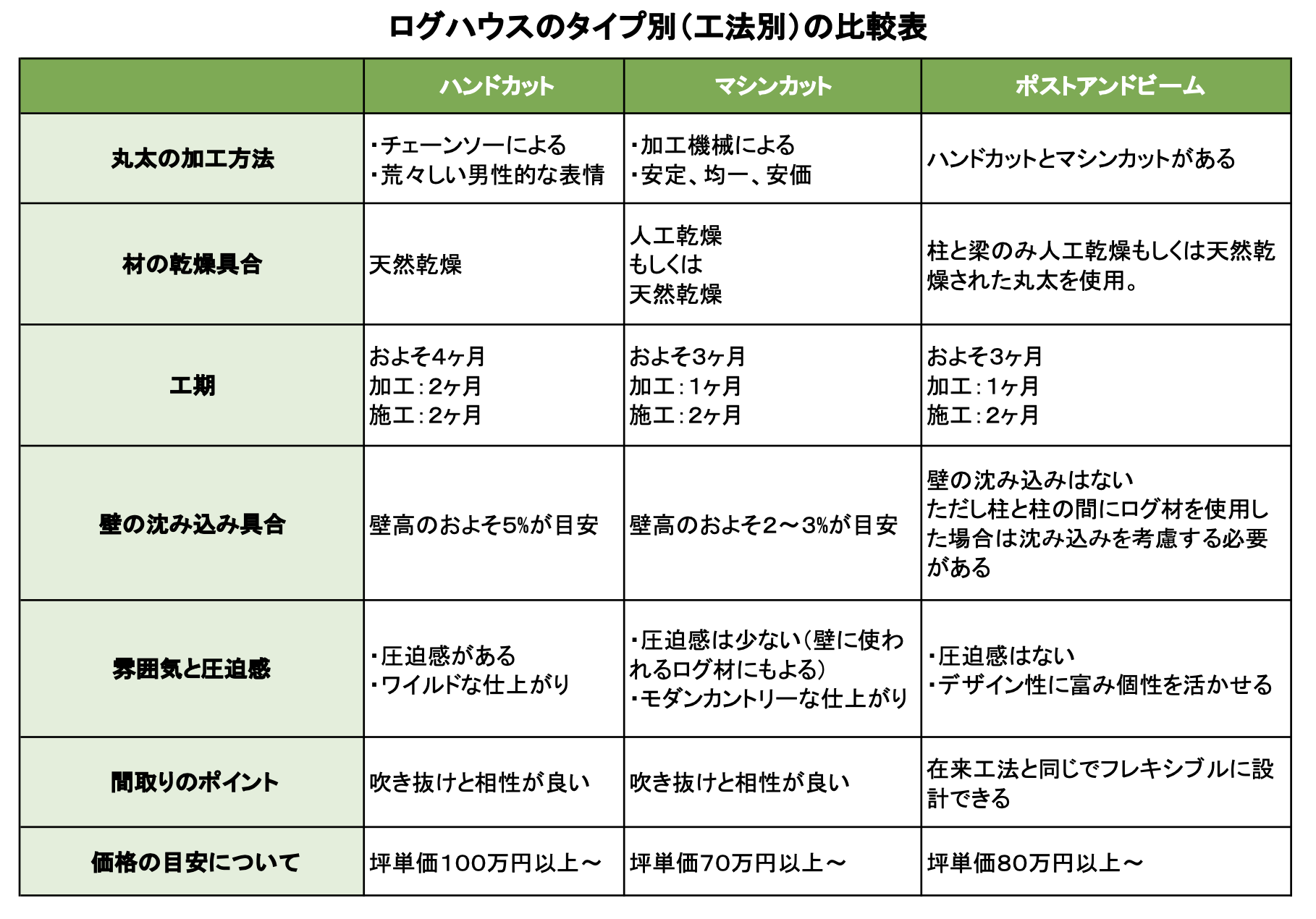 ログハウスの工法ごとの特徴をまとめると下記の図のようになりますので参考にしてください。