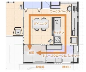 キッチンを対面式にして行き止まりがないような間取りにし、ぐるぐると水まわり周辺を回れる回遊動線をプランに組み込むとより家事効率を高めた間取りになるからです。