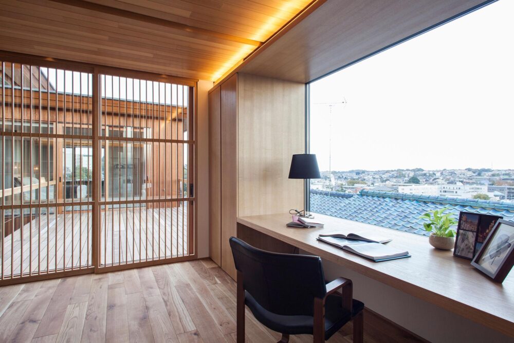 壁に向かって横長の水平方向に長い開口部を設けて外部の風景を取り込むことで、実際の面積が狭くても狭さを感じさせない書斎になります。