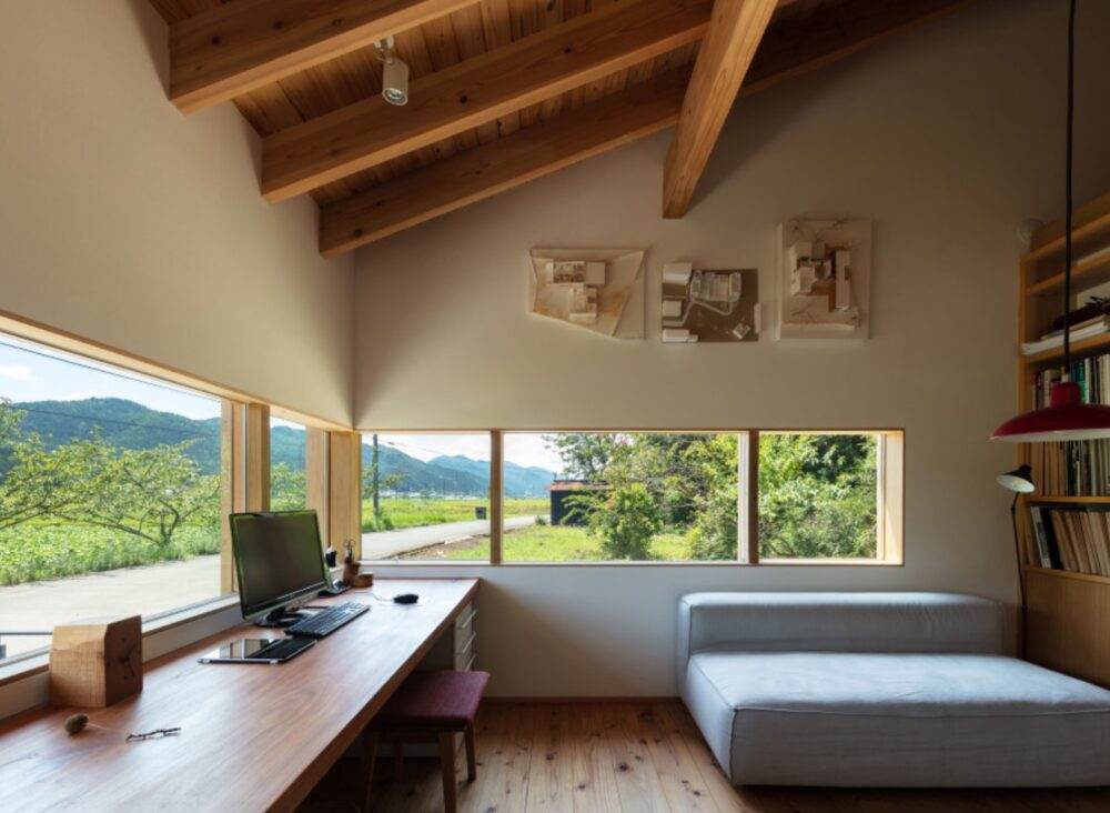 横長の開口部を設けた際は、視線の先に自然の緑が見られるような間取りにするとより狭さを感じさせない快適な書斎になります。