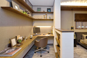 オープンスペースタイプと言いますが、セミオープン仕様の書斎も多く、例えば寝室の一角を間借りし簡易的な仕切りをするタイプの書斎などもあります。