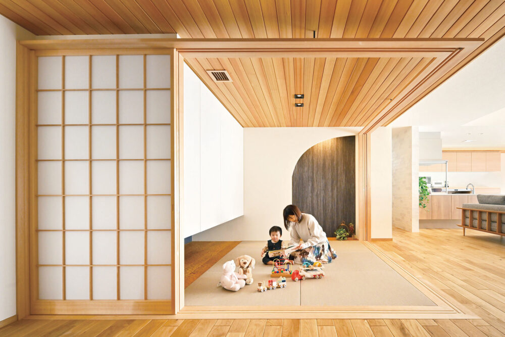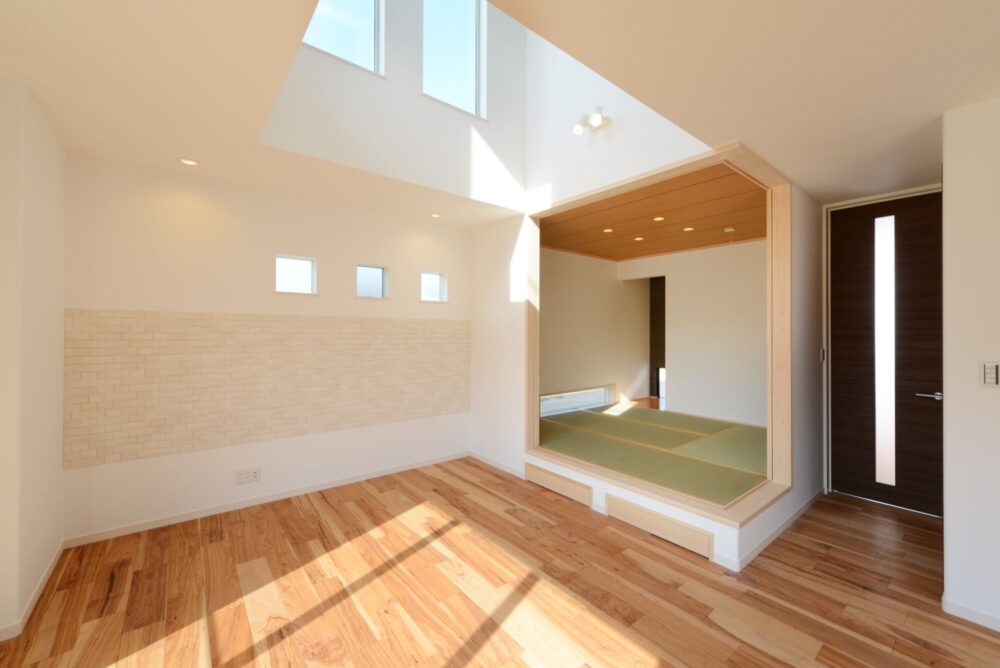 LDKが吹き抜けの空間の場合、小上がりの和室の高さを2100mm程度に抑えて配置することで高さのコントラストが生まれ、吹き抜けのLDKはより高く、小上がりの和室にはより落ち着きが生まれます。
