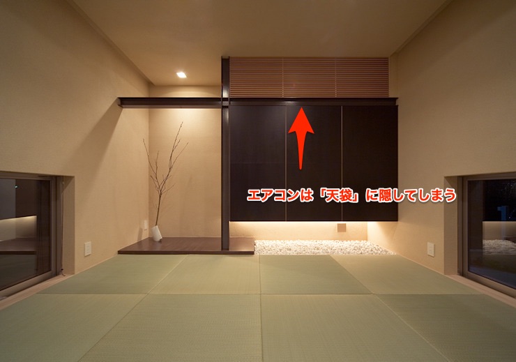 和室にする場合、エアコンは押し入れ上部の格子状の天袋を設け、いっそのこと見えないように隠してしまった方がいいでしょう。